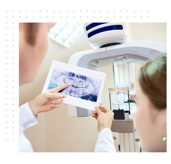 - Examination of diagnostic x-rays (radiographs): Essential for detection of decay, tumors, cysts, and bone loss. X-rays also help determine tooth and root positions.